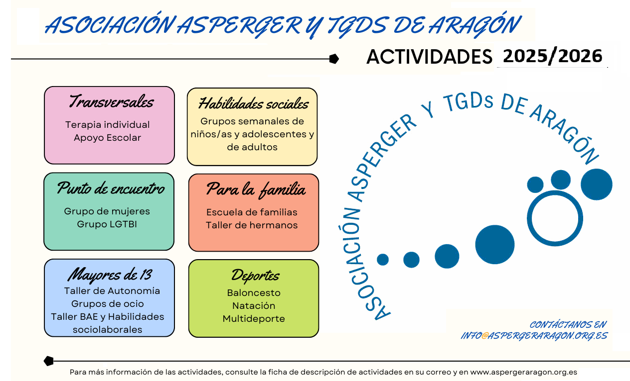 - Taller de hermanos: Se pretende establecer unas sesiones en las que se cree un espacio de confianza en el que poder tratar diferentes temas relacionados con el Síndrome de Asperger y la convivencia con personas diagnosticadas con él. Se quiere ofrecer una herramienta que permita conocer diversas pautas que mejoren la relación y convivencia con personas diagnosticas con el síndrome, así como dar la oportunidad de crear un espacio donde poder expresarse y permitan establecer lazos entre hermanos/as en el contexto familiar.