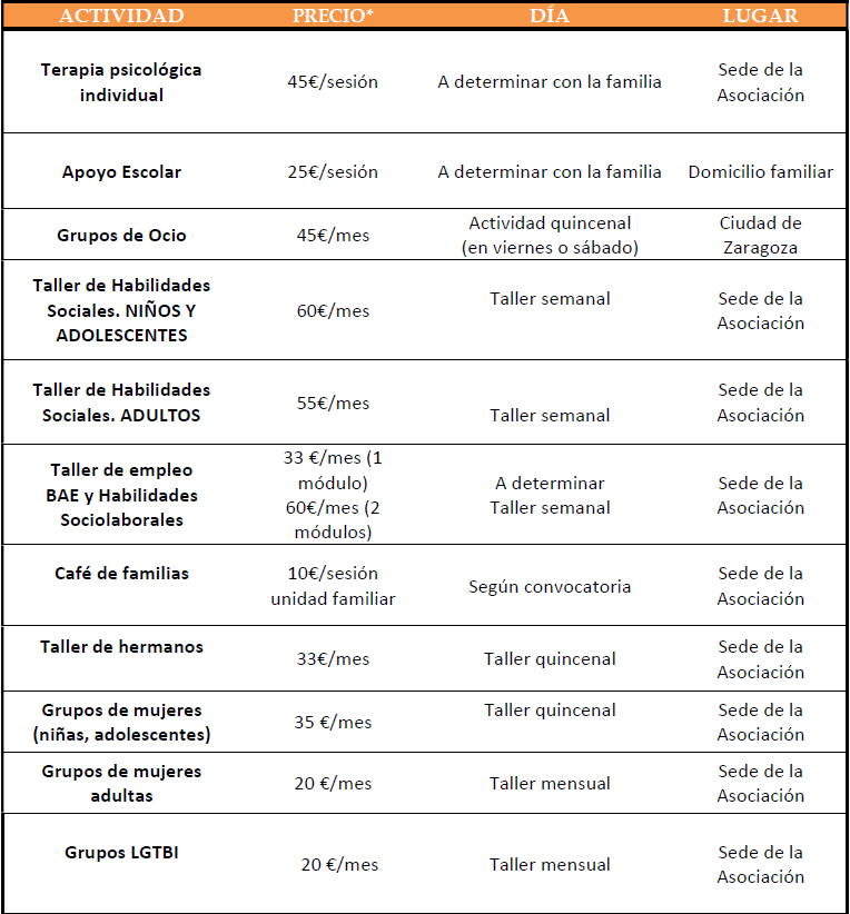 - Grupos de ocio: Se trata de un grupo de ocio y apoyo mutuo para jóvenes y adultos. Su objetivo es trabajar las relaciones con el grupo de iguales, ampliar y compartir intereses, incrementar conocimientos de oferta de ocio y autonomía. La mayoría de las actividades se realizarán en diferentes lugares de Zaragoza, dependiendo de las ofertas de ocio que se ofrezcan en la ciudad durante el curso.