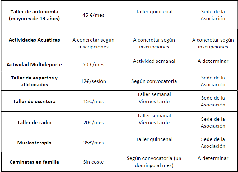 - Taller de escritura: Actividad dirigida a todas las edades que consiste en crear un grupo de redacción dentro de la asociación. Se creará un blog donde todos los participantes puedan exponer sus artículos. Ellos serán los encargados de elegir un tema y establecer cómo quieren afrontar la publicación.